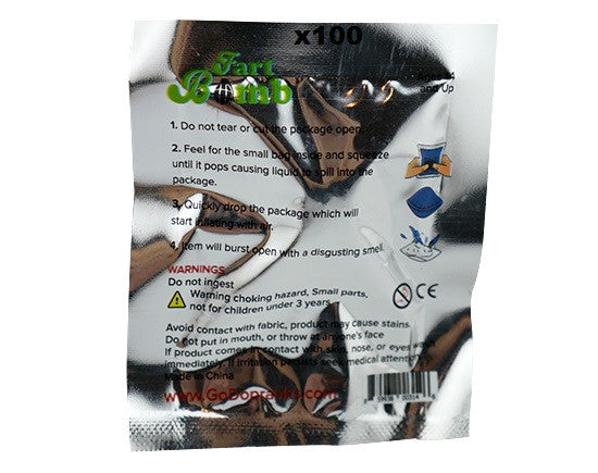 You will get 100 fart bombs, that's right 100! Press the little packet inside and quickly throw, the bag will start to expand and bust making a loud noise and smell like rotten eggs.